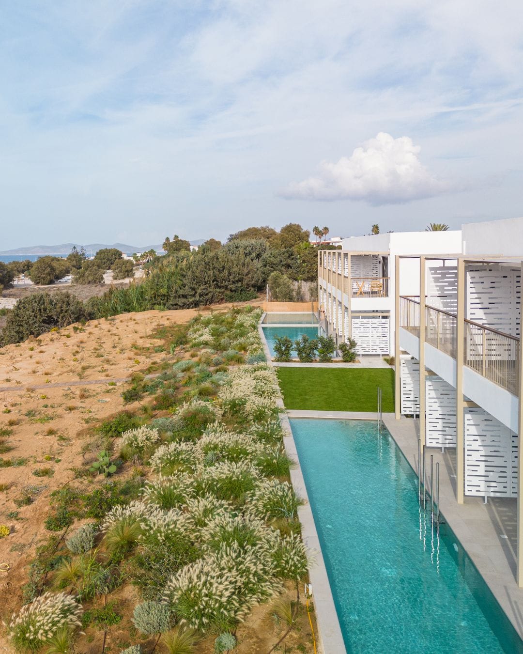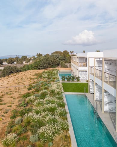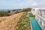 approx. 30-32 m2 open plan; located on the ground floor in front of the beach with uninterrupted sea view plus direct access to a sharing pool & either a private sundeck with sunbeds or a smaller terrace with poufs