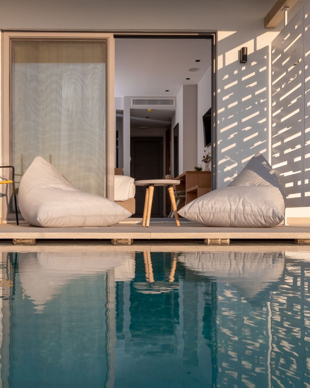 approx. 27-28 m2 open plan; located on the ground floor with sea view plus direct access to a sharing pool & either a private sundeck with sunbeds or a smaller terrace with poufs